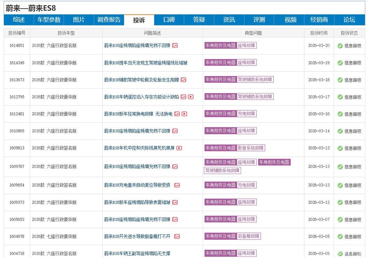 值得一提的是,在车质网平台上,目前关于全新蔚来ES8的投诉就已经涵盖了座椅塌陷、影音系统故障、高速动力失速等典型性问题。虽然上述投诉仅为部分车主的反馈,具体问题是否为共性问题,尚未有明确的统计结论。但众口铄金,人口想传,很多人可能因此认为,全新蔚来ES8并非十全十美,甚至怀疑车价相较上一代车型(第二代)大幅降低的同时,其实际的品控或许也因此而有所打折。