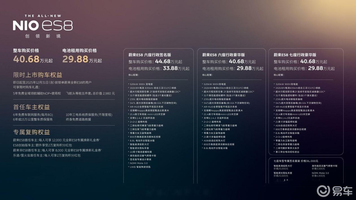 毕竟,蔚来全新ES8上市时,其900V高压架构、智能底盘、静谧座舱等均是核心卖点。